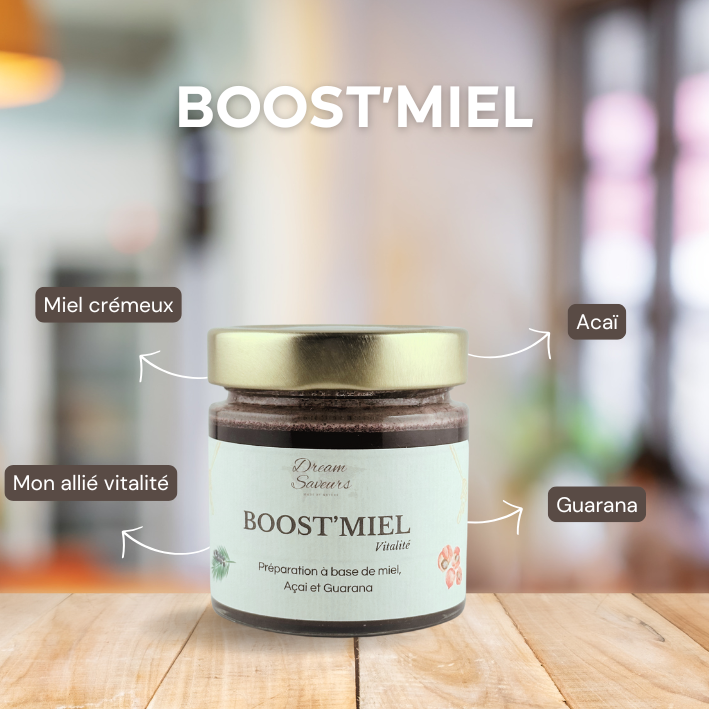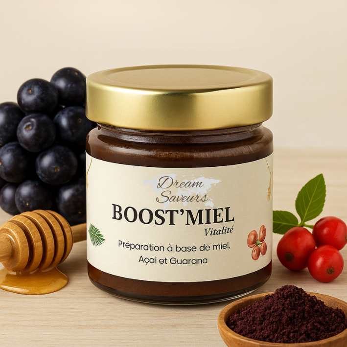 Envie d’un coup de boost 100 % naturel ? Découvrez Boost’miel, une alliance tonique et savoureuse de miel, açaï et guarana, pensée pour réveiller votre énergie tout en douceur.